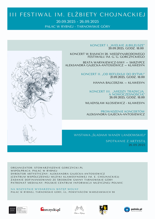 Z ogromną przyjemnością zapraszamy do Pałacu w Rybnej w Tarnowskich Górach na III Festiwal im. Elżbiety Chojnackiej, który jest doskonałą okazją do poznania zarówno dawnych, jak i współczesnych trendów w muzyce klawesynowej, a także muzycznego dziedzictwa Elżbiety Chojnackiej, której pasja i zaangażowanie w promowanie muzyki klawesynowej nieustannie inspirują kolejne pokolenia artystów i słuchaczy.